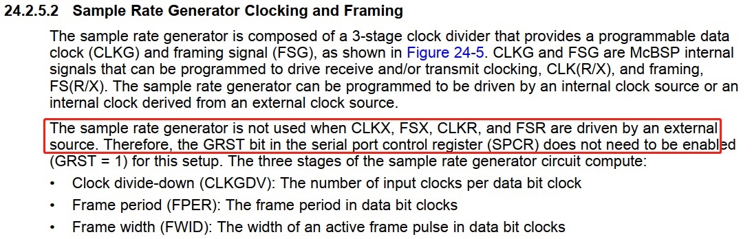 那如果我要使用CLKR、CLKX作为SRG时钟源,势必要把它们设置为输入也就是外部驱动(这个想法是否正确?),根据24.2.5.2此时SRG又没有用,岂不是说CLKR、CLKX作SRG时钟源形同虚设?