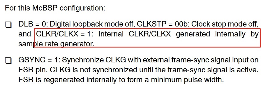 • ”The sample rate generator is not used when CLKX, FSX, CLKR, and FSR are driven by an external source.“这句话的意思是当CLKX, FSX, CLKR和FSR这四个时钟都由外部提供的话,就不用Sample rate generator来产生时钟了。