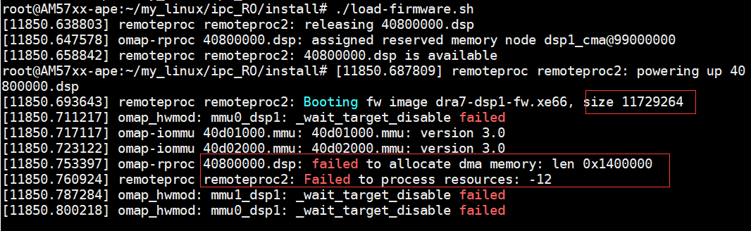 本人dsp程序大小为11.7M,arm使用load-firmware.sh加载dsp程序时报错。0x40800000地址是dsp1的L2RAM,是否是ARM先将DSP1程序放到L2RAM,然后再到DDR运行,请教如何修改才能解决报错信息?(dsp可执行文件11.7M,机器人程序太大且无法缩减)