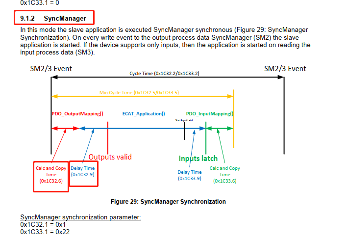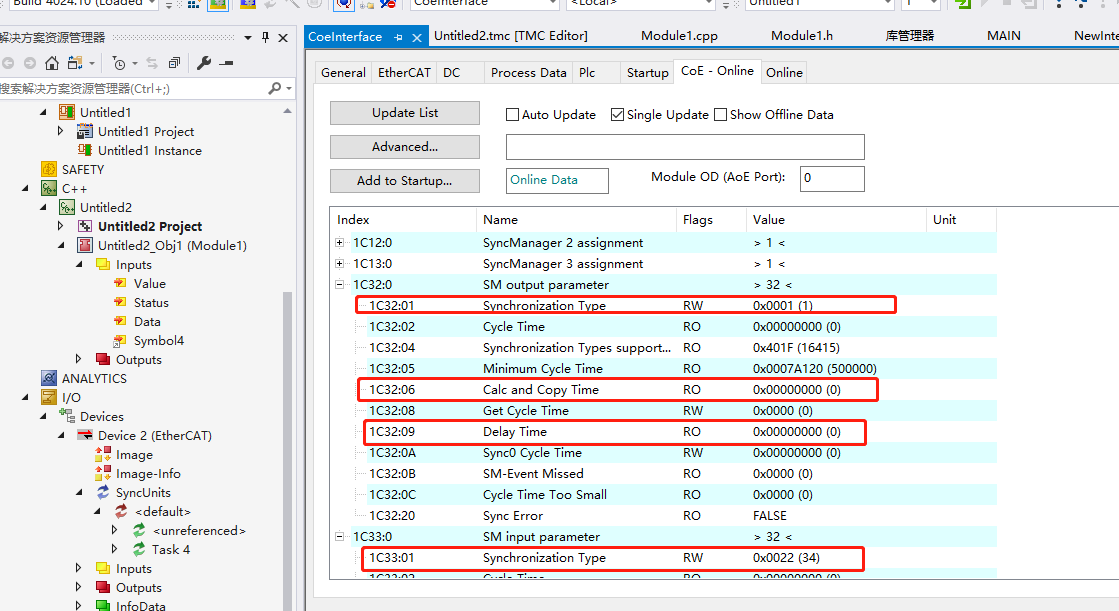 你好,我现在使用的是28388的评估板,调试EnterCAT功能。当我用TwinCAT3进行调试并进入运行模式,不开启DC功能,处于SM模式,其中Calc and Copy Time和Delay Time为0.