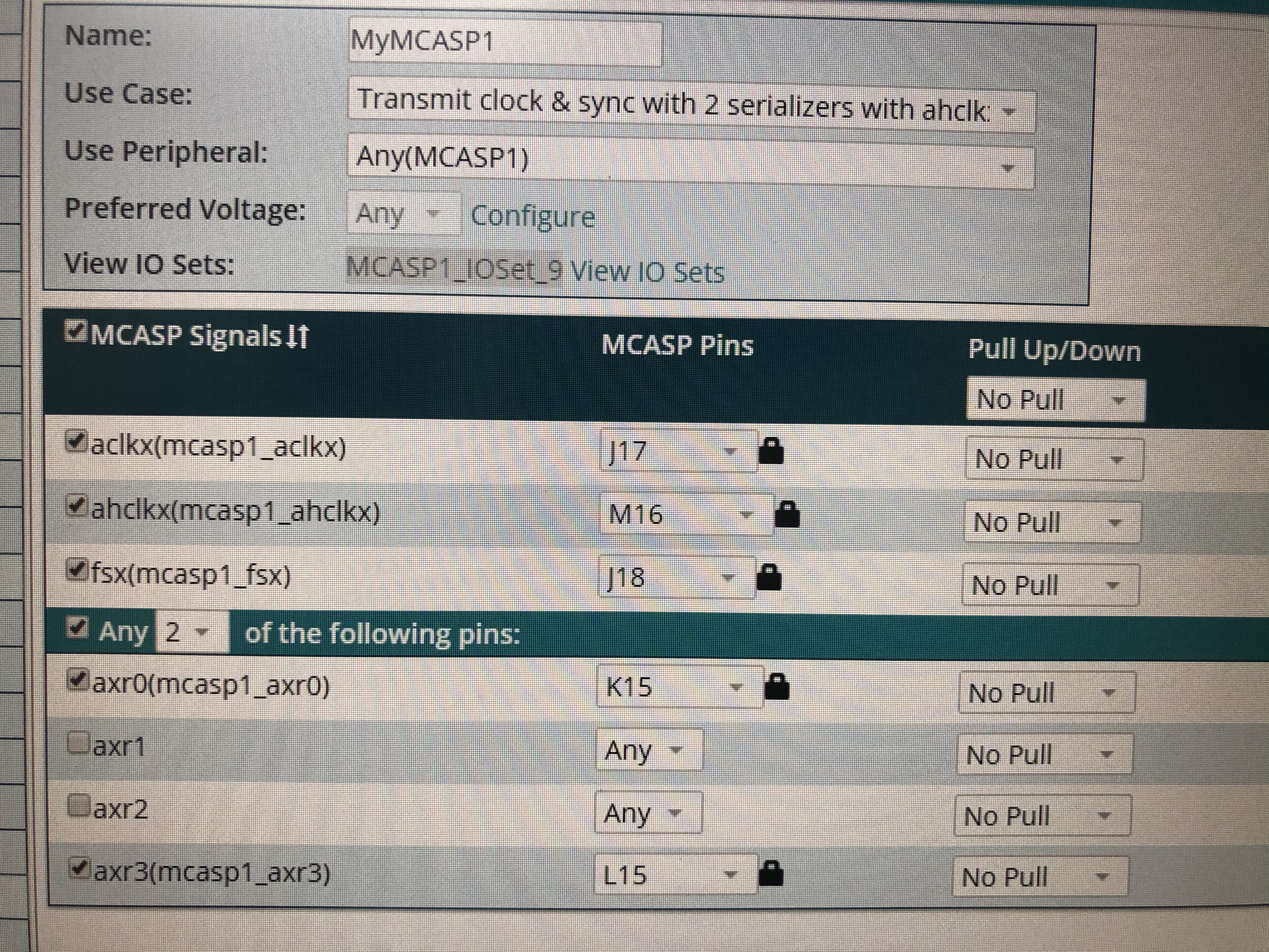 现在的pinmux配置如下,计划是想am3352 做master,wm8974 slave,3352的晶振是25MHZ。 这样的配置如果i2s采样位深为16bit,采样率要在(8, 11.025, 16, 22.05, 24, 32, 44.1, 48kHz,wm8974只支持这些 )范围内。感觉怎么分频都不行啊,是不是硬件设计有问题啊。。。