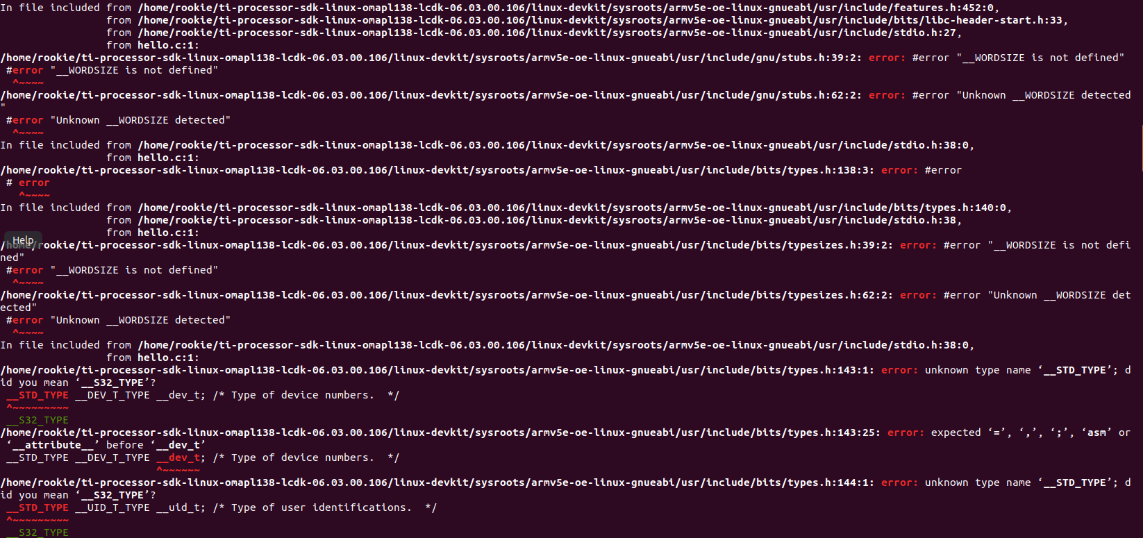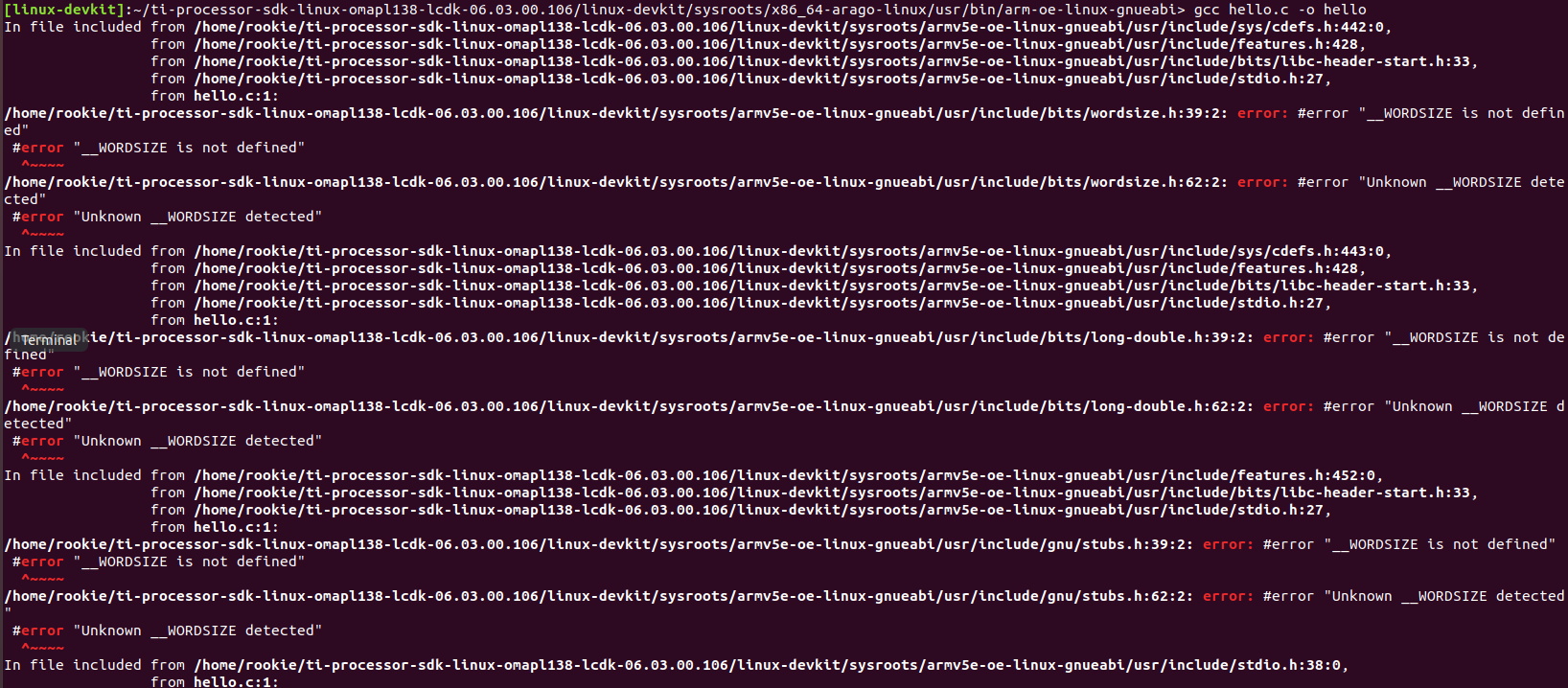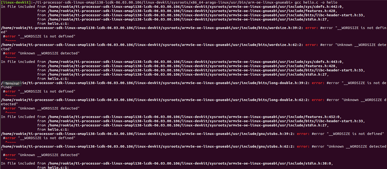 在/home/rookie/ti-processor-sdk-linux-omapl138-lcdk-06.03.00.106/linux-devkit/sysroots/x86_64-arago-linux/usr/bin/arm-oe-linux-gnueabi目录下写了hello.c后,