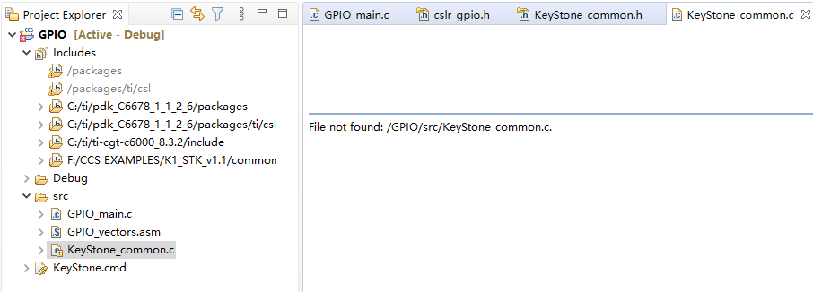 在K1_STK_v1.1的例程GPIO中,工程里的KeyStone_common.c无法打开。我在源文件目录里发现并没有这个文件。然后从其他文件夹中复制了这个文件到这个工程中,但仍然显示找不到