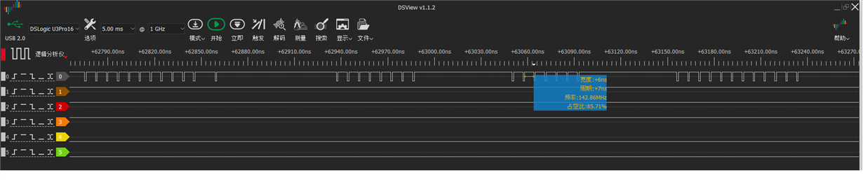 外部晶振为25MHz,在C6748中想把EMIFA的时钟设置到130-148MHz的告诉水平,同时不想主频低于400MHz,于是在PLL中将倍频系数设置为16(实际主频就等于17*25MHz=425MHz),并将PPL0中的SYSCLK3分频系数设置为2(理论输出是425/3=141MHz),这个给EMIF用,那么EMIFA的时钟理论上就是141MHZ(低于EMIFA最大的148MHZ),但实际用1GHz带宽的逻辑分析仪测试这个时钟信号发现,这个时钟信号偶尔是141MHz左右,但大部分时钟信号的频率是乱的(远低于141M),如下图所示。