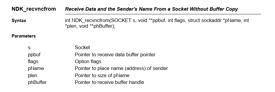 recvncfrom(s, (void **)&pBuf, 0, (PSA)&sinDst, &tmp, &hBuffer);