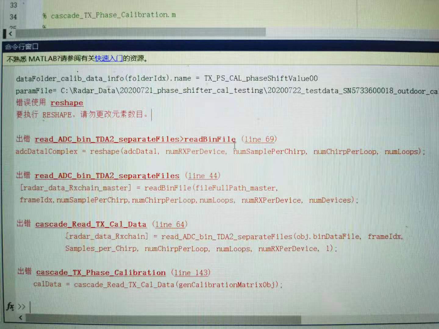 2)在按照参考文档给的配置,设置cascade_TX_Phase_Calibration.m的读取datasets的路径,但找不到refDevices=4 这个设置变量,运行.m后出现使用reshape错误,具体错误截图如下