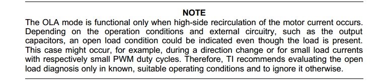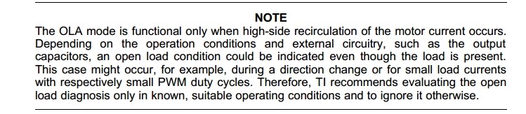 你好!我们在使用DRV8873这块芯片时,客户在PID调试过程中,会发生开路故障误报的情况,由于当前此芯片用于控制节气门位置,所以没有使用Open-Load Detection in Passive Mode,而是Open-Load Detection in Active Mode (OLA)