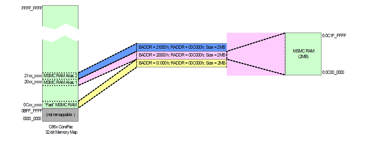 按照ti手册示例,通过设置XMPAX寄存器将MSMC映射到不同的不同的逻辑地址区域。映射后,逻辑地址0x20100000和0x21000000开始的区域应该对应的是同一个物理存储区,并设置MAR寄存器使这两个区域为non cacheabilty。