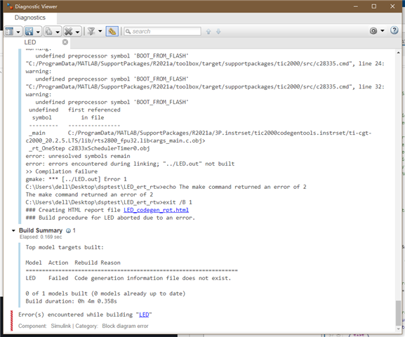 C:/ProgramData/MATLAB/SupportPackages/R2021a/3P.instrset/tic2000codegentools.instrset/ti-cgt-c2000_20.2.1.LTS/lib/rts2800_fpu32.lib C:/ProgramData/MATLAB/SupportPackages/R2021a/toolbox/shared/supportpackages/tic2000/rtlib/IQmath_fpu32.lib C:/ProgramData/MATLAB/SupportPackages/R2021a/toolbox/target/supportpackages/tic2000/src/c2833xPeripherals.cmd C:/ProgramData/MATLAB/SupportPackages/R2021a/toolbox/target/supportpackages/tic2000/src/c28335_flash.cmd <Linking> undefined first referenced symbol in file --------- ---------------- _main C:/ProgramData/MATLAB/SupportPackages/R2021a/3P.instrset/tic2000codegentools.instrset/ti-cgt-c2000_20.2.1.LTS/lib/rts2800_fpu32.lib<args_main.c.obj> _rt_OneStep c2833xSchedulerTimer0.obj error: unresolved symbols remain error: errors encountered during linking; "../LED.out" not built >> Compilation failure gmake: *** [../LED.out] Error 1 C:\Users\dell\Desktop\dsptest\LED_ert_rtw>echo The make command returned an error of 2 The make command returned an error of 2 C:\Users\dell\Desktop\dsptest\LED_ert_rtw>exit /B 1 ### Creating HTML report file LED_codegen_rpt.html ### Build procedure for LED aborted due to an error.