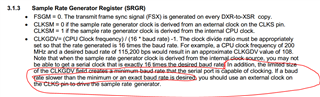 • 因为CLKGDV的范围在0~FF,根据CLKGDV= (CPU Clock frequency) / (16 * baud rate) -1公式,对应的baud rate也有一个取值范围。如果要使用的波特率不在这个范围内,需要考虑外接时钟作为sample rate generator的时钟输入。