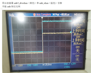 进行测试usb转以太网时发现,USB1_VBUS点的电压,不超过1.3V,模块报错:VBUS error workaround (delay coming),而且usb1无法使用;
