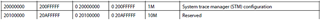 问题1、该方法中将多核共享内存映射到了起始地址为0x20000000的地址空间,而该地址空间的原本定义属于“System trace manager (STM) configuration”和“Reserved”,如图2所示,请问该映射方式是否合适?如果合适,那么“System trace manager (STM) configuration”的寄存器空间是不是就不能正常配置STM了?映射到“Reserved”的地址空间是否可行?