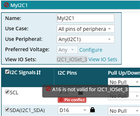 提示A16管脚不能作I2C1管脚用,应该是被其他外设用掉了。请参考数据手册第42页上A16管脚的复用功能。