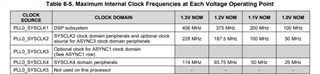 该型号根据 CVDD 电压在不同的最大频率下工作,当CVDD为1.0v时,最大主频为100MHZ,请参考截图中的表格。