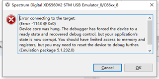 1.连接仿真器后,第一次连接核心失败,提示核心挂起;