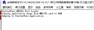 经截图 4中的各个转换过程,最终在工程文件夹中得到gpioLEDBlink_ti.bin,将该bin文件复制到前面步骤中已复制了MLO文件的SD卡中,并将此bin文件重命名为app,插卡,上电,串口打印信息如下:
