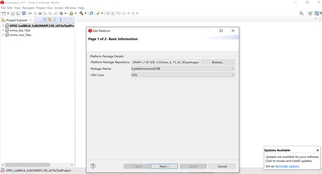 结合您给的https://www.ti.com/lit/ug/spruex3v/spruex3v.pdf文件的7.2.1节,想问下图片中的Platform package repository是应该选xdctools目录还是bios的目录?因为按照pdf文档里选择bios目录的话,package name和cpu core都无法进行选择,而按照上图的目录选择,package name是可以进行选择的,所以想确认一下Platform package repository的目录应该选哪个?