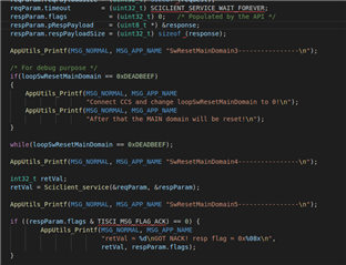 以上是最终的log信息和部分相关代码,可发现在Sciclient_service处卡死。我们已经在查看Sciclient_service里的内容,但是Sciclient_service这个函数调用的函数较多,且我们编译时间较久,暂时没找到程序在哪里卡死,公司项目较为紧急,麻烦TI帮忙查一下是哪里的问题。