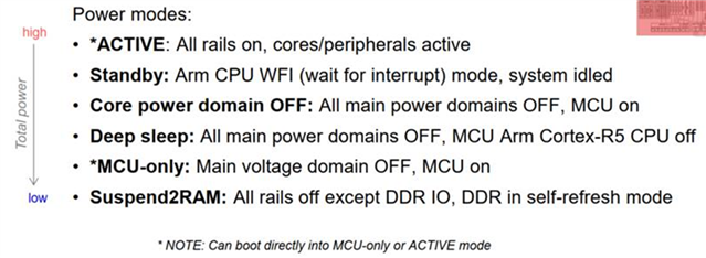 Active, Standby, Core power domain OFF, Deep sleep, MCU only, Suspend2RAM.