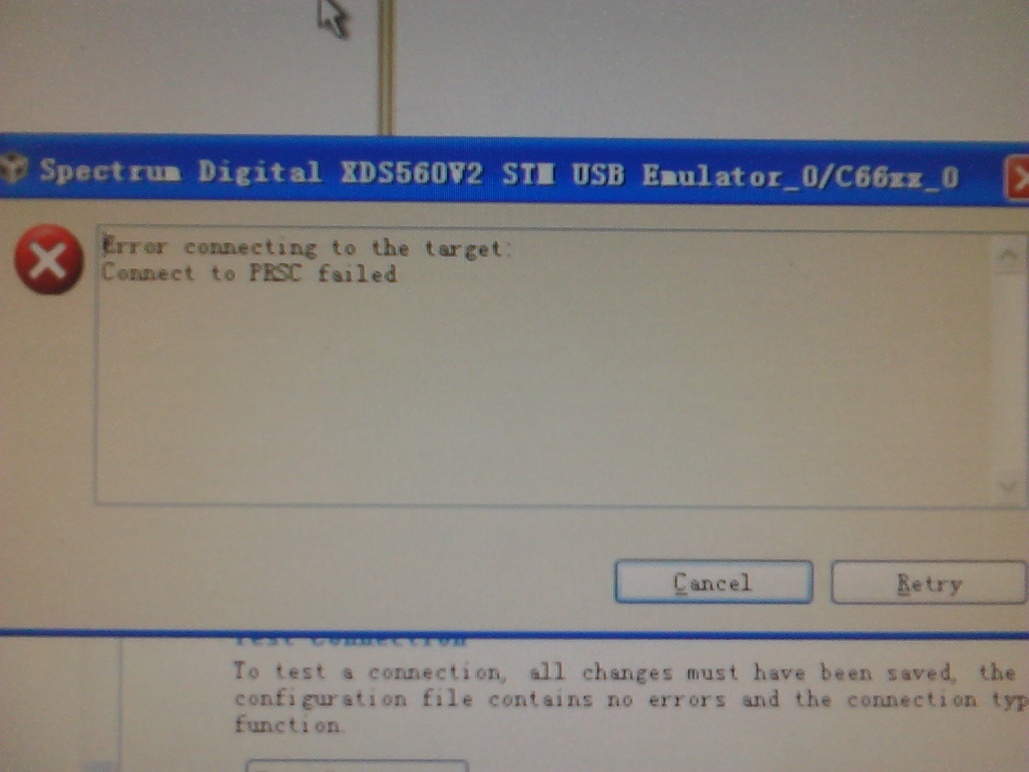 请教一下各位大神,小弟刚开始学c6678,在CCS5.1环境下,添加好源文件,cmd文件和xxcml文件后,生成.out文件。连接仿真器调试时总是出错啊。老是提示说:Error connecting to the target. connect to PRSC failed.   我用的是XDS560 V2的仿真器。由于目前我只用到一个核,所以只对一个核配置了GEL文件。