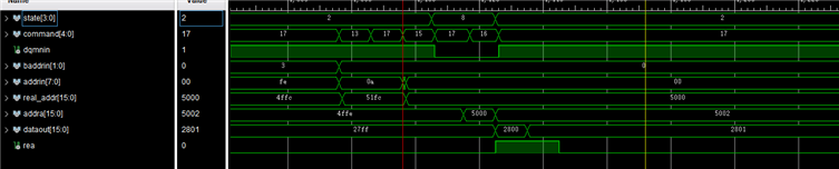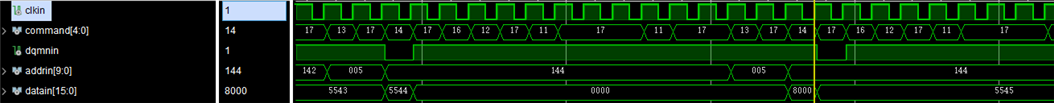 FPGA采到的信号如下:command是对照TRM文档Table18-5设置的,11对应REFR,12对应PRE,13对应ACTV,14对应WRT,(15对应READ,下图没有READ命令),16对应BT,17对应NOP。clkin是时钟线,dqmnin是DQMn[0],addrin是地址总线,datain是数据总线,都是DSP引脚的信号