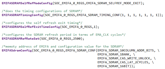 (第一个设置的是Self refresh mode,按照TRM文档18.3.2.1.1的说明,应先ENTER,再配置PLL,最后EXIT,由于我在GEL配置了PLL,把EMIFA的时钟配置为25M,所以直接EXIT. 中间三个关于我认为对时序的影响不大,所以就随意配了。)