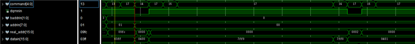 第二个13(ACTV)下面的0x005是row address,14(WRT)下面的0x144是column address,然后在16(BT)之前有两个数据,分别是WRT下的0x8000和NOP下的0x5545,分别对应的DQMn[0]是1和0