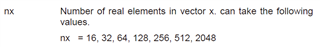 nx Number of complex elements in vector x. Must be between 8 and 1024.