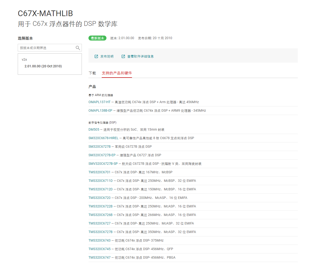 • 您好,时间是直接用IO测试的;发现测试一句cosf指令的时间变长了,但执行多句的时间是变少了,这是什么问题? 还有1.在C67X-MATHLIB 驱动程序或库 | TI.com.cn网页(如下图)看到该库支持的硬件里没提到C6713B,那fastmath67x.lib是否支持C6713B芯片呢? 2. 在我的工程中直接添加fastmath67x.lib后编译的.map里就可看到fastmath67x,并不需要把此库添加到标准的 run-time-support library前面这个操作呀,我想问看到.map里有fastmath67x是不是就代表已经添加成功了?