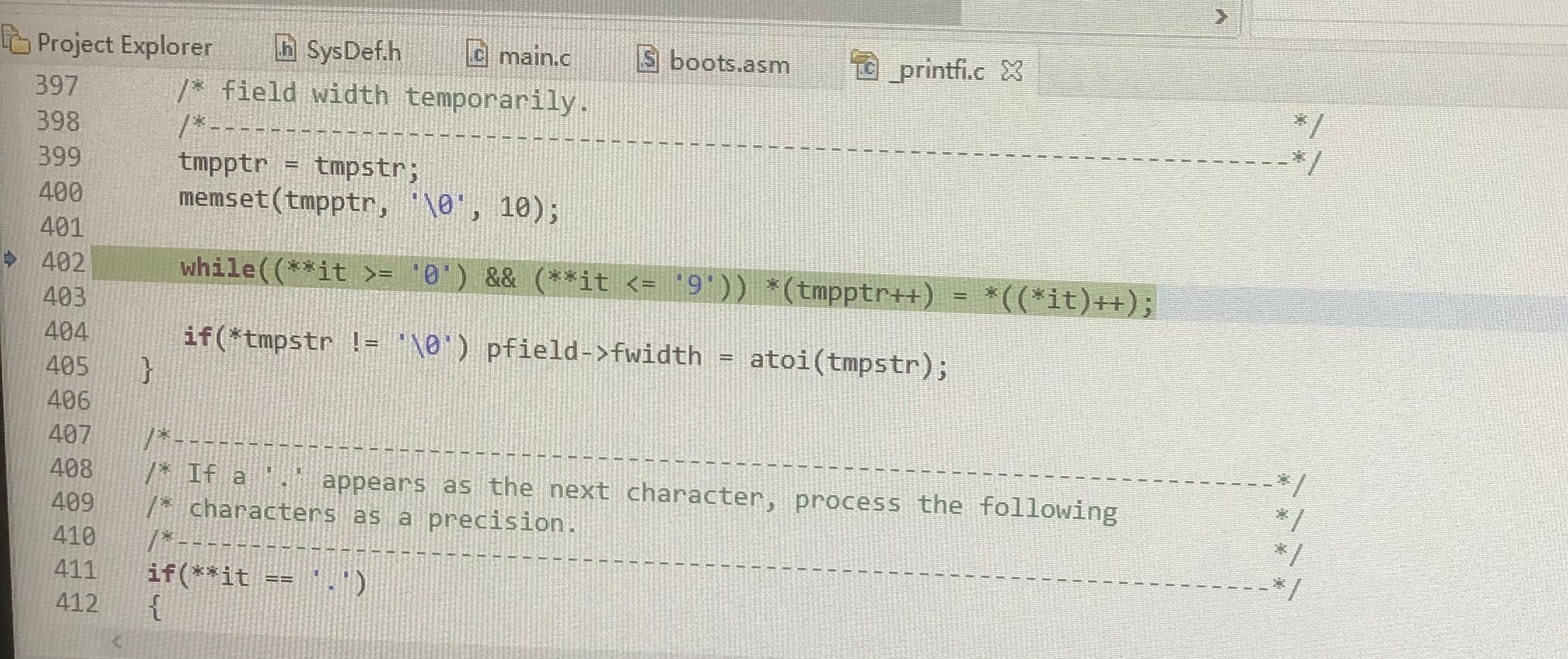 3.在烧写过程中,不对按键进行操作,让程序一直运行。当程序运行到最后一行时,程序并没有自己停止。当我点击CCS中的“暂停”选项时,发现程序卡在_printfi.c这个函数的402行不动了,如图所示。再点击运行也卡在这里。重新运行多次也一样。