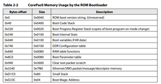 在论坛中某个帖子中,TI给了一个客户的案例(作者:钱丰),其中《SPI_boot原理》文档中给出了ROM Bootloader使用的内存空间,如下图: