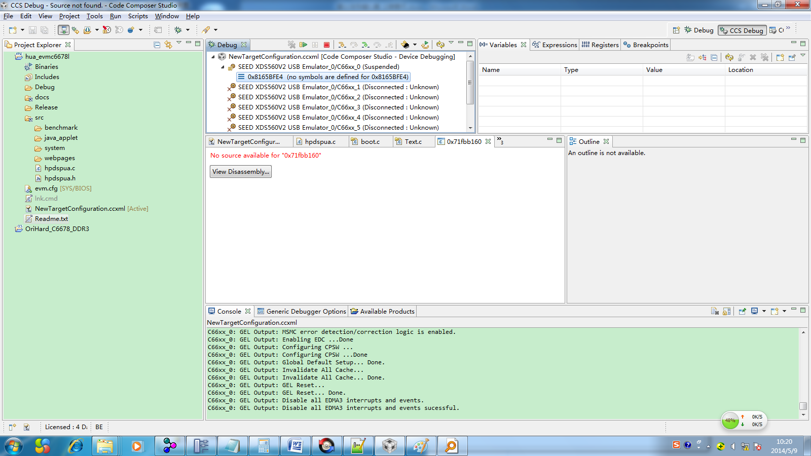 继续单步运行,又是一直处于running状态,暂停便出现如下错误:C66xx_0: Trouble Halting Target CPU: (Error -1202 @ 0x0) Device core is hung. The debugger will attempt to force the device to a ready state to recover debug control. Your application's state will be corrupt. You should have limited access to memory and registers, but you may need to reset the device to debug further. (Emulation package 5.1.232.0)
