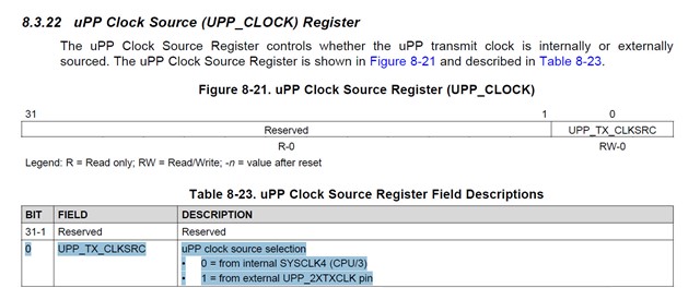 请查看最新的数据手册8.3.22 uPP Clock Source (UPP_CLOCK) Register。