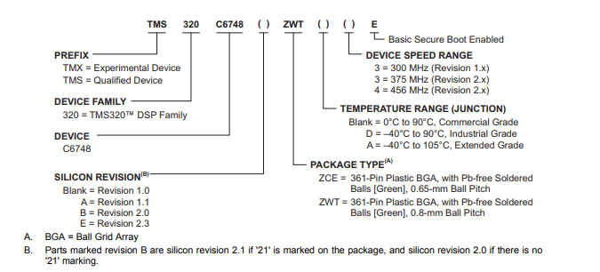 以前用的是TMS320C6748EZWT4,456M的,但是新买的是TMS320C6748BZWT,感觉不对劲,也查不到差别,麻烦问芯片第三行是什么意思,怎么看它的工作温度和工作频率?