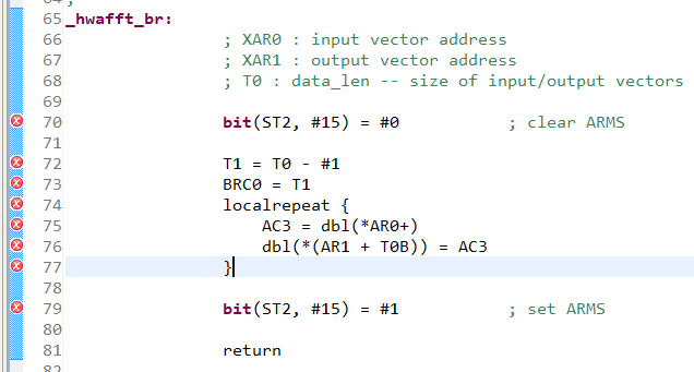 大家好! 不知道有谁做过实时fft呢? 本人刚接触dsp以及ccs, 我用ti提供的hwafft.asm做fft时发现这个文件里几乎全是错误, 我已经把要include的文件都include了, 但是一直有错误, 不知道大家对引用asm文件有什么建议呢?谢谢大家!