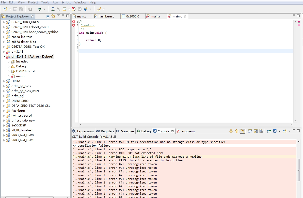 我在CCS5.3中,新建了一个DM8148的工程,自带main.c,直接编译,也会提示有错误,详情请看附件中,谢谢!!!
