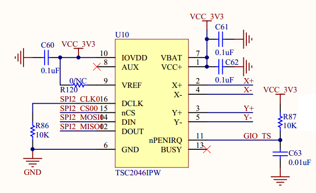 问题:通过DM365的SPI2通道与tsc2046连接,SPI2通过SPIDEV_TEST自环测试成功。点击触摸屏有中断产生,但是tslib界面不能正常反应,一直停留在第一个十字。逐步定位问题后发现,无论DM365端给TSC2046发送什么数据,TSC2046反馈的数据都是0x8080,从而导致ads7846_rx_val函数接收到的数据(x,y,z1,z2)经过be16_to_cpup转换后都是4112,进而在计算ads7846_rx中Rt时,导致Rt值为0,从而不会上报事件,表现为触摸屏没反应。