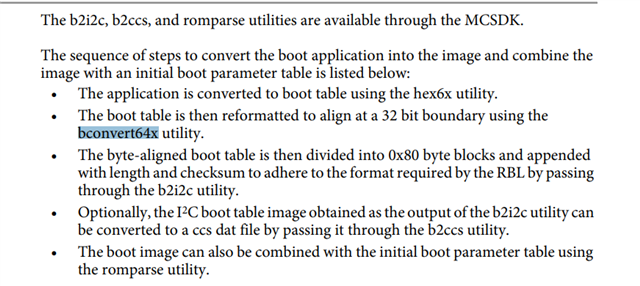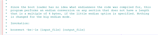 在生成boot参数表时,会遇到程序段长度不是4字节整数倍的情况,使用hex6x以及b2i2c工具生成的btbl文件会将程序段大小补成4字节整数倍,这时候需要将原来不是4字节整数倍的数据内容和补充的内容进行字节序交换,否则程序搬移会有问题,会搬移补充的内容而不是原始的数据,查了下DSP Bootloader User Guide,需要用bconvert64工具进行数据交换,请问应该如何使用这个工具?