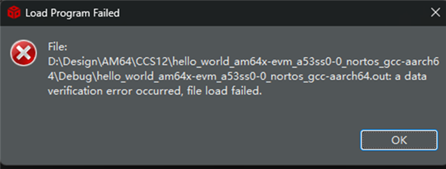 CortexA53_1: GEL: File: D:\Design\AM64\CCS12\hello_world_am64x-evm_a53ss0-0_nortos_gcc-aarch64\Debug\hello_world_am64x-evm_a53ss0-0_nortos_gcc-aarch64.out: a data verification error occurred, file load failed.