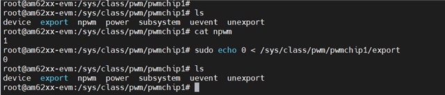 在使用echo 0 > /sys/class/pwm/pwmchip0/export时无法产生PWM1 文件,测试AM62评估版的leds--led-0时同样无法生成,请问可能是什么原因?