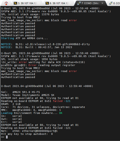 您好,我现在在调试我们的自制板am6231,使用的时8.6版本的SDK,现在使用SD无法启动没有任何的打印输出,之前在am6234上用SD卡可以正常启动,am6231和am6234区别在于单核和四核,我在uboot的设备树节点中屏蔽了其他三个核的节点信息,请问还需要做那些修改。
