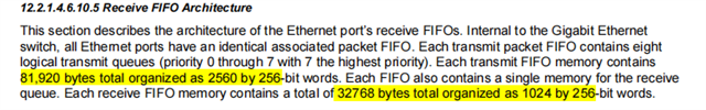 首先 CPSW存在两个对外的以太网端口。然后根据上述描述:我认为 每个 以太网端口fifo包含:8个逻辑发送队列(共80K大小),1个接收队列(共32K大小),即一共112K大小。请问我的结论是否正确。