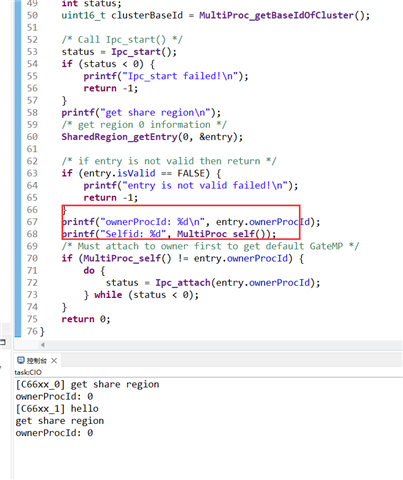 目前创建了两个工程,一个核0,一个核1,核0与核1之间通过ipc模块使用共享内存区域SharedRegion,调用MessageQ接口进行消息传递,若两个代码放在L2SRAM中运行,则能够正常运行;若将代码等段,通过cfg配置到DDR3中,则会出现无法attach状况,如下图所示,两个核一直无法互相attach上。