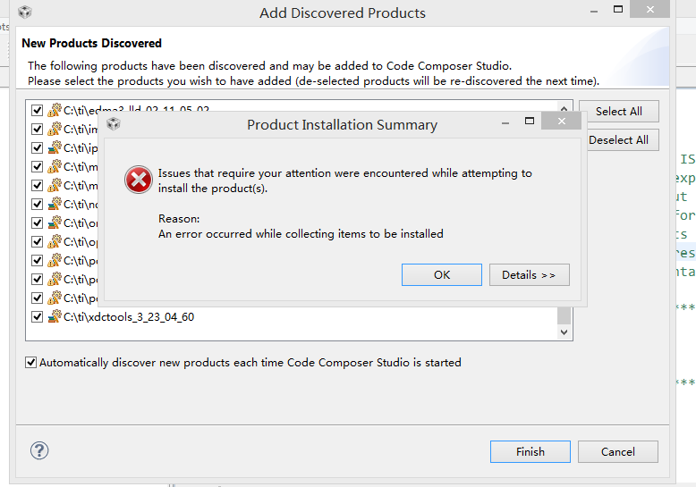 最近在学习6678,安装biosmcsdk后,打开ccs v5时,提示我add discoverd product,然而我点击finish时,却提示出错,如图所示