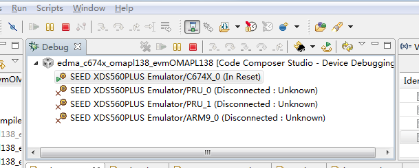startware 的例子工程“edma_c674x_omapl138_evmOMAPL138”,在自己做的板子上跑,编译链接都成功,也能连上板子,但是下载进去后处于复位状态,如下图。点终止运行弹出以下错误:“C674X_0: Trouble Halting Target CPU: (Error -1137 @ 0x0) Device is held in reset. Take the device out of reset, and retry the operation. (Emulation package 5.1.73.0) ”。