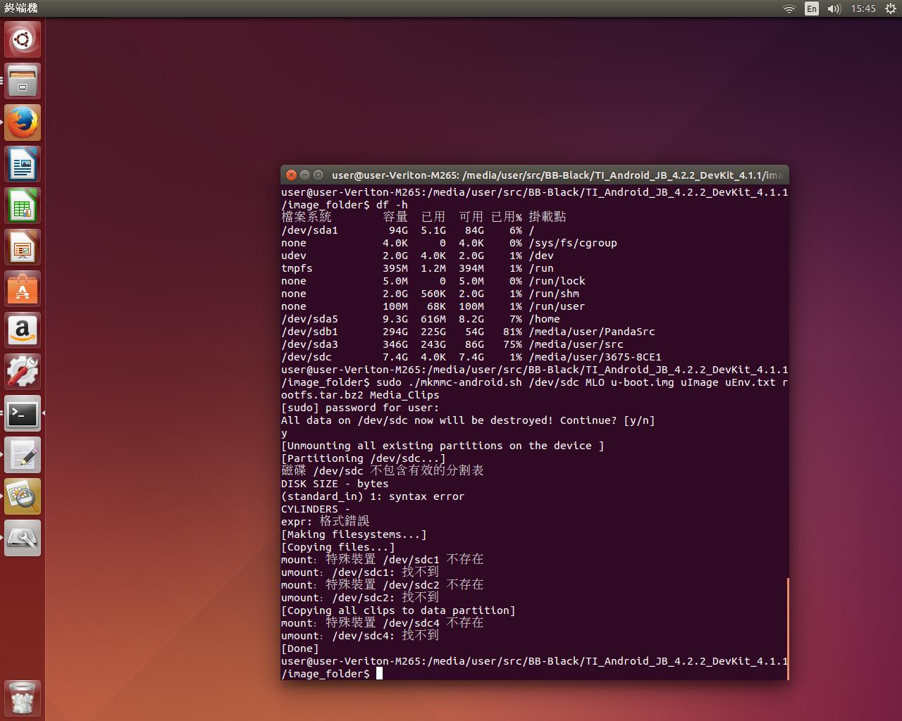 執行 sudo ./mkmmc-android.sh /dev/sd<sd card mount-point> MLO u-boot.img uImage uEnv.txt rootfs.tar.bz2 Media_Clips