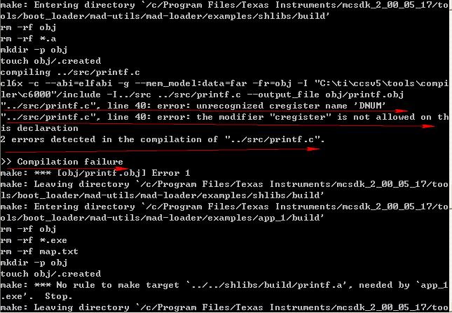 我在做C:\Program Files\Texas Instruments\mcsdk_2_00_05_17\tools\boot_loader\mad-utils\mad-loader\examples这个例子时遇到了如图中划红线所示的错误,这是怎么回事情?请各位专家帮忙看看。