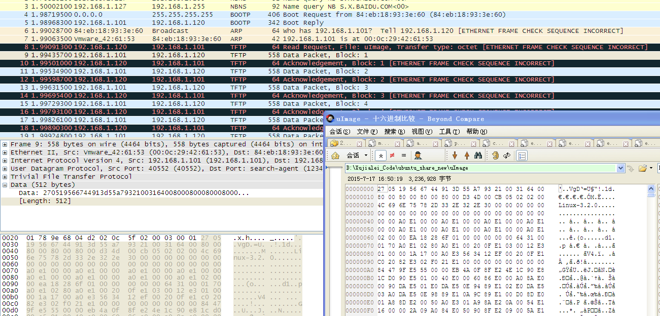 按照文档《AM335x的网口启动及Flash烧写用户指南.pdf》中的1、2、3步骤配置修改完毕,一上电发现板子就会去下载uImage,下载uImage然后就是tftp校验失败:AM3352板子发给tftp服务器的包有误:ETHERNET FRAME CHECK SEQUENCE INCORRECT,且串口无任何反应;这个阶段软件几乎还没开始操作什么,请TI的同事帮忙分析下到底是什么原因,谢谢!