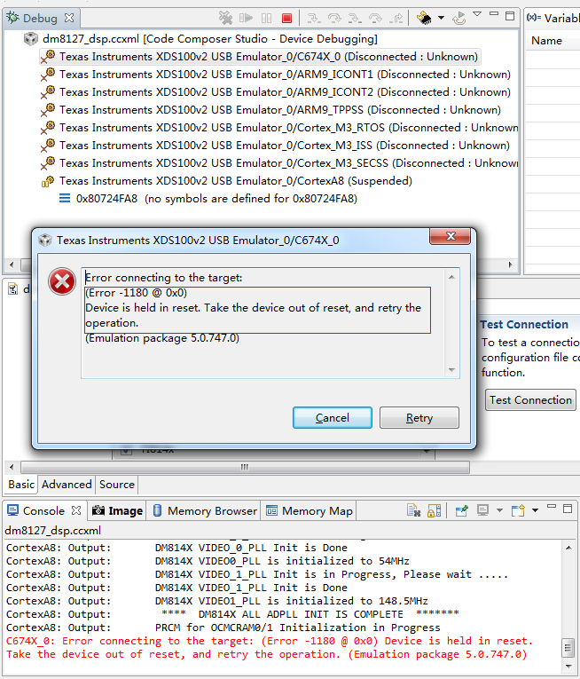 但就是连接DSP一直连接不上,连接的过程中报 -1180的错误,想请教各位大神帮忙解答一下,谢谢!