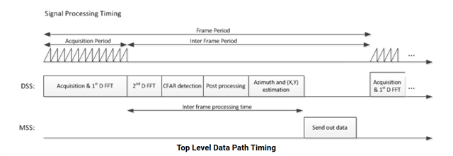 请参阅下面雷达传感器中的数据路径时序。在采集期之后,要有用于处理的帧间期。因此,占空比无法达到100%